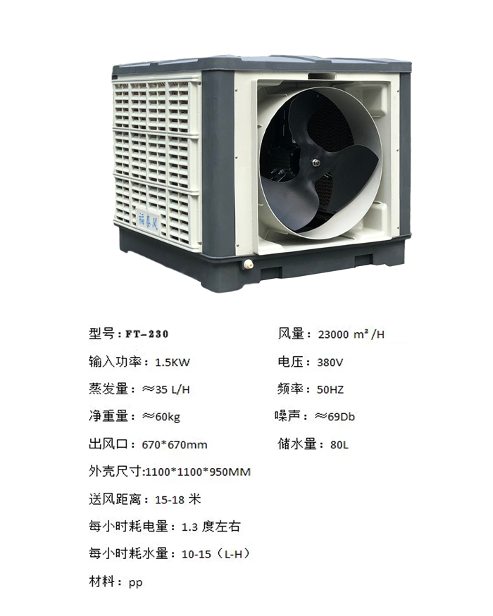 福泰环??盏餍阅芪榷ㄔ谠窖兹鹊奶炱陆滴碌男Ч胶谩J视糜诳ㄊ郊鞍肟ㄊ交肪常芄恢苯邮渌妥匀环缂笆渌徒滴潞蟮牧狗?。室外新鲜空气经福泰蒸发式冷气机过滤、降温后向室内源源不断的大量输送,将室内带有异味、粉尘和混浊闷热的空气排出室外,同时兼顾换气降温及增加空气含氧量等多种效果。
